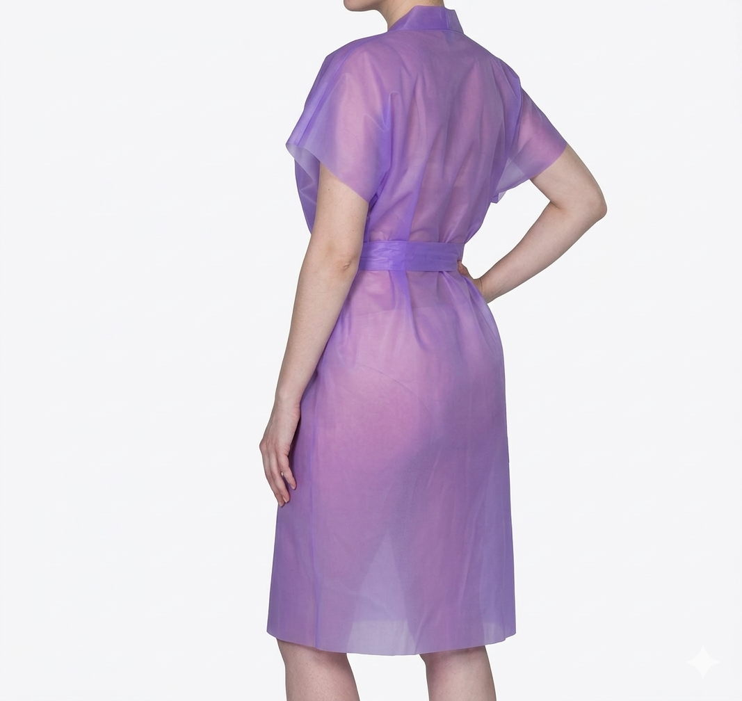Sleeveless disposable robes made of spunbond (30 g/m²) provide personal hygiene and comfort and are suitable for use in cosmetology. The kimono-style design with a belt and universal size makes them suitable for both men and women. The material does not stretch or tear, does not cause allergies, and helps protect against the penetration of bacteria. It does not create static electricity or attract dust, ensuring a comfortable experience for the client. The product is intended for single use and should be disposed of after use.